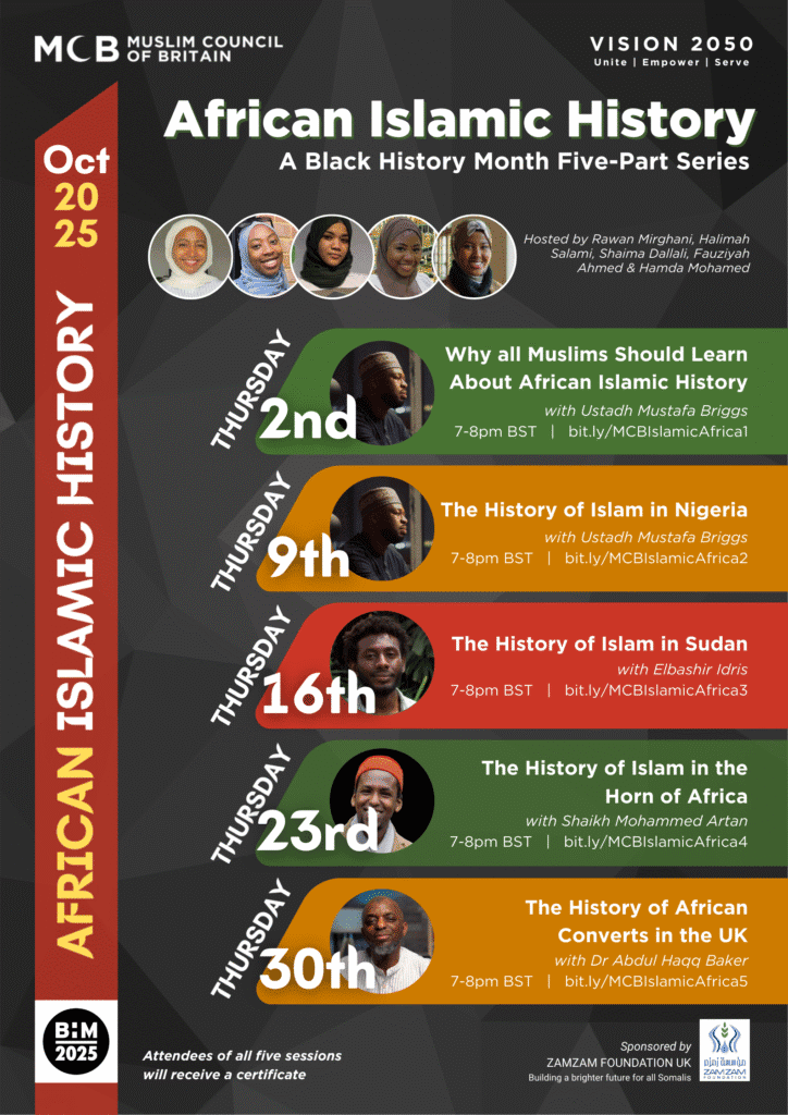 Our African Islamic History Series will open with Why Every Muslim Should Learn About African History, before exploring the remarkable histories of Nigeria, Sudan, the Horn of Africa, and finally, the inspiring stories of African converts here in the UK.