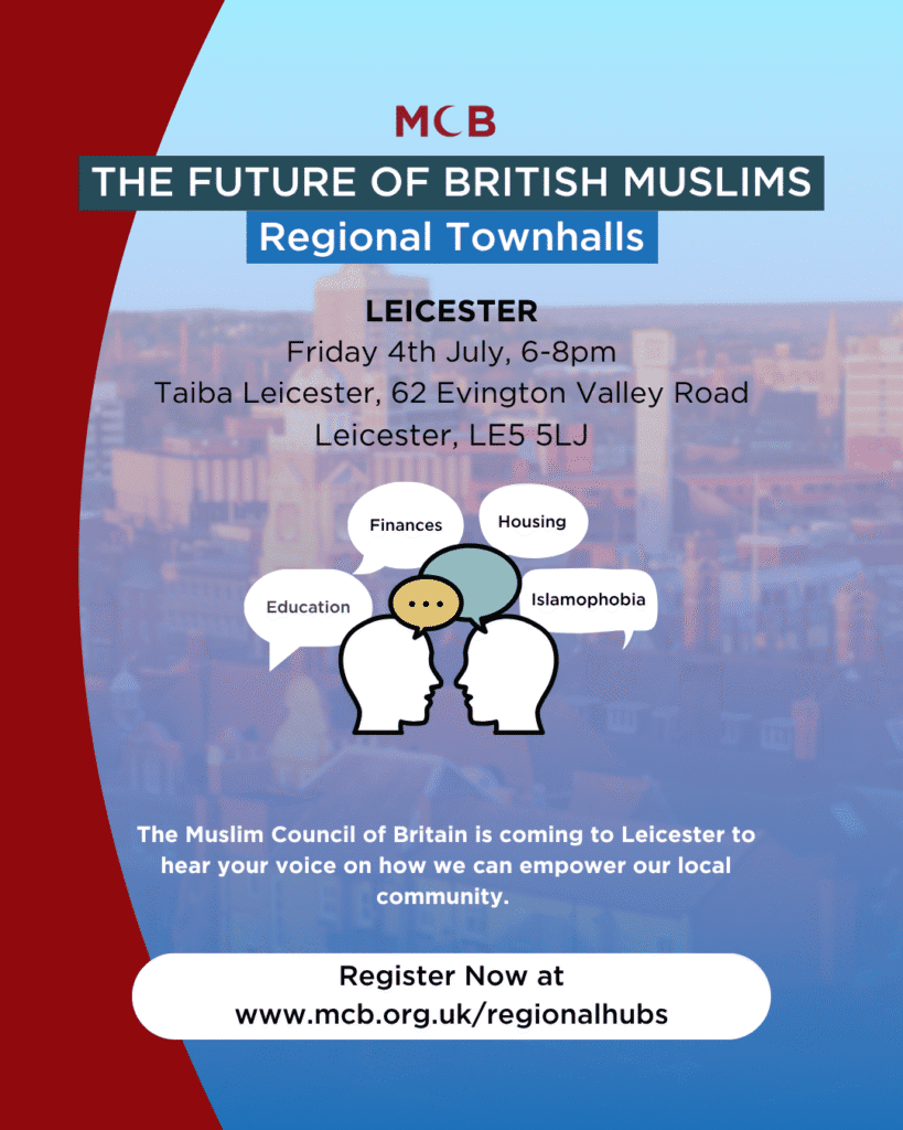 This Townhall is an opportunity to discuss key issues affecting the Muslim community in Leicester. Whether it’s Islamophobia, education, financial security, housing, or any other concerns close to your heart, we want to hear from you.