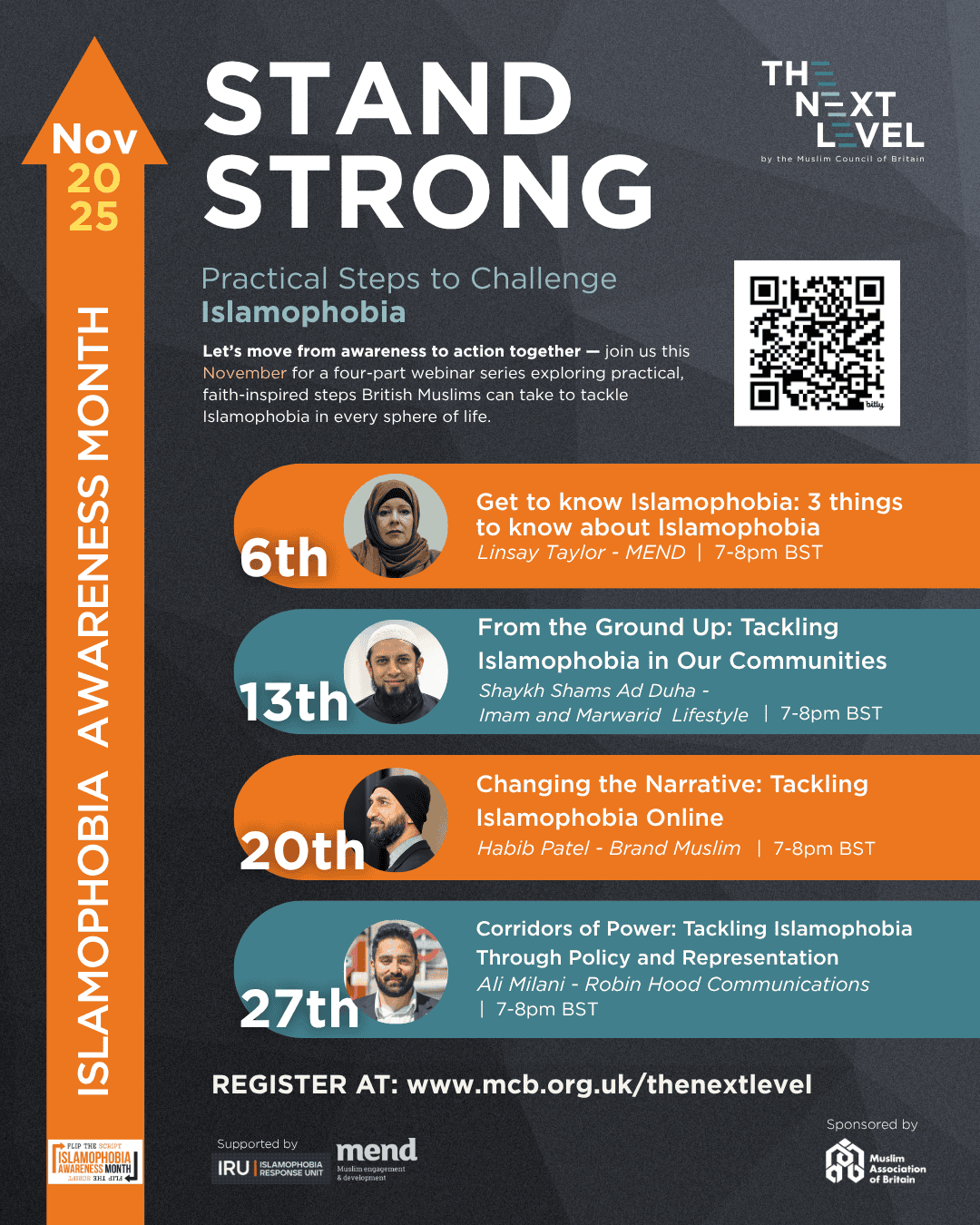 This November, we’re hosting a four-part webinar series all about taking real, practical steps to challenge Islamophobia in everyday life. Each session will dive into real issues from the workplace to online spaces, from local communities to national conversations, with leading speakers and thinkers sharing practical ideas you can use right away.